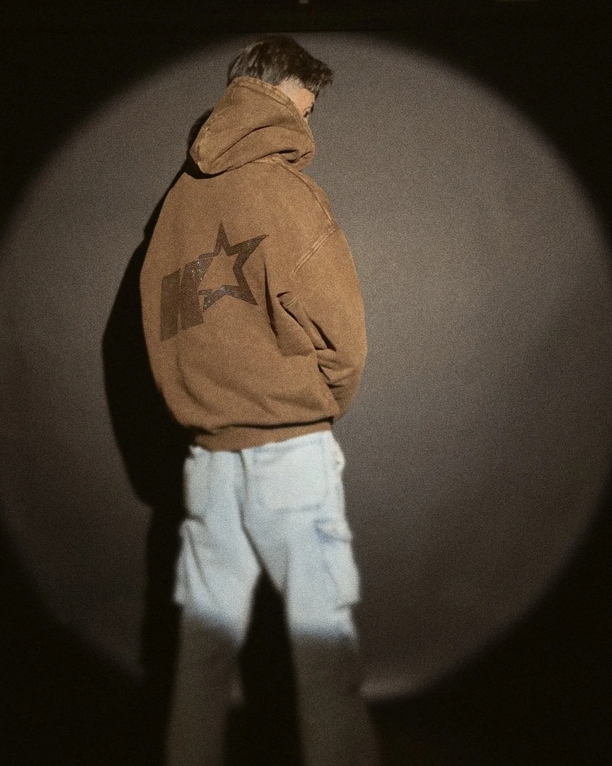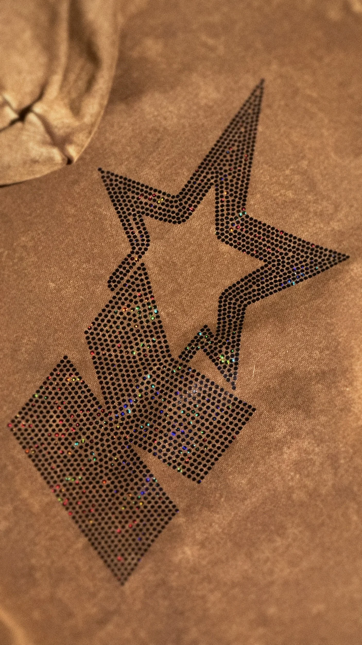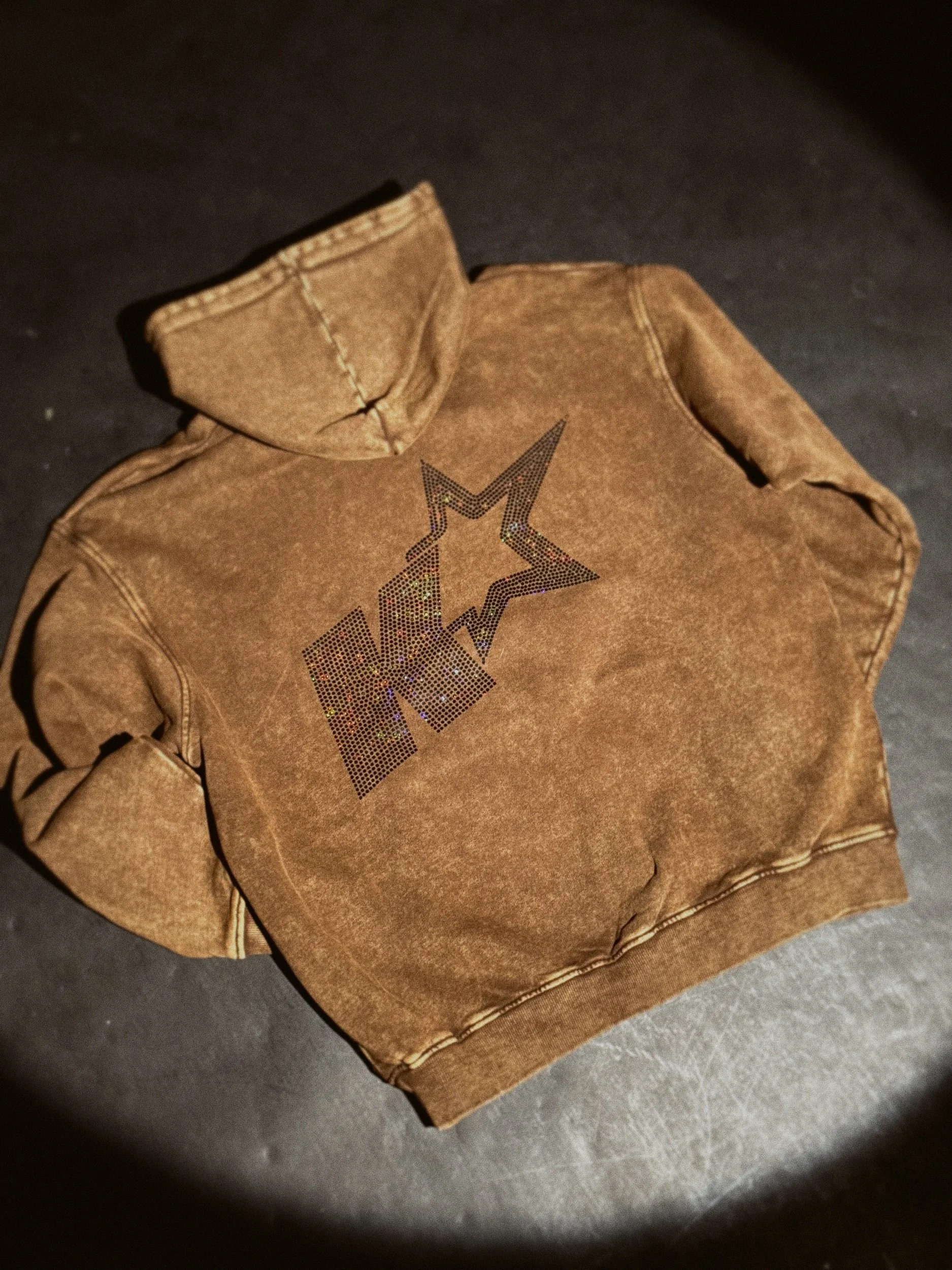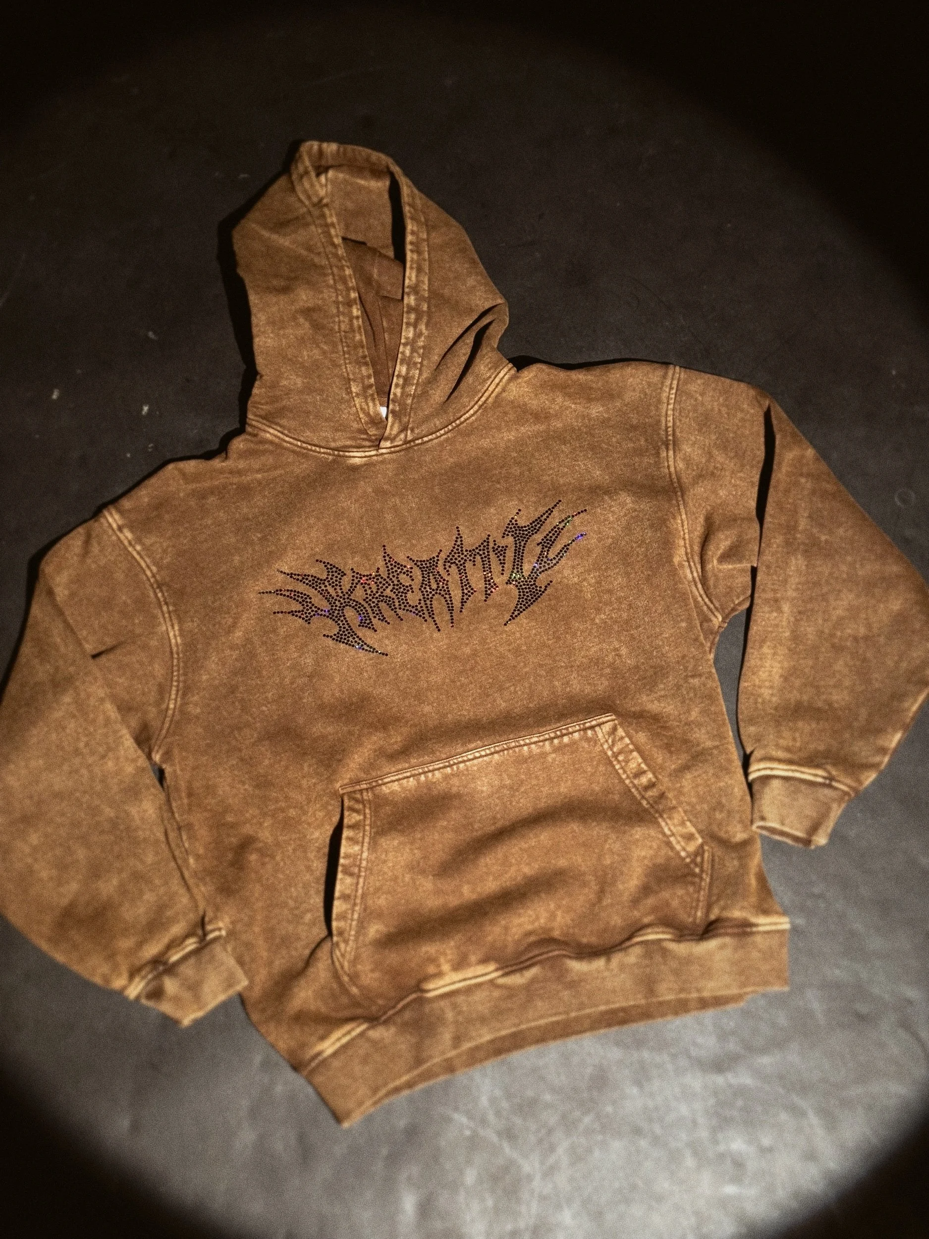 This heavyweight faded brown hoodie brings raw energy with a perfectly washed finish and cracked character. Featuring a sharp, spiked KREATIV logo front and center in rhinestones, and the popular K STAR logo in the back made out of rhinestones as well. This hoodie blends subtle flex with street-born aggression. Boxy in build. Loud in texture.